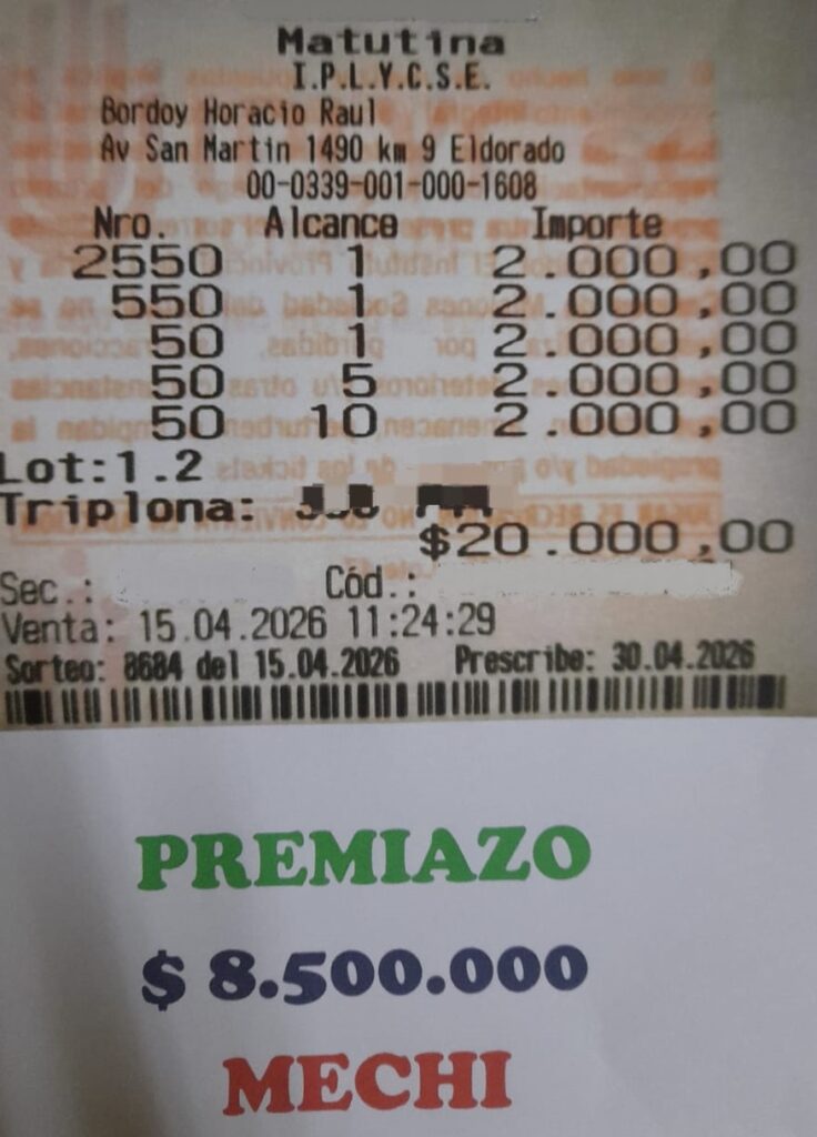En la Agencia 339 “La primera en pago de premios”, de Eldorado, se pagan grandes premios en apuestas realizadas en sorteos de la Quiniela. Hoy hacemos referencia a un acierto logrado por un aficionado de la casa, que realizó su jugada en las dos quinielas de la Matutina Misionera del miércoles 15 de abril. El número elegido fue el 2550 (El pan), que fue a parar a la cabeza de la Matutina Misionera, la apuesta a las cuatro, tres y dos cifras, le reportó una recompensa de 8.500.000,00 de pesos.
