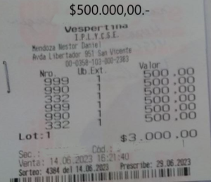 Desde San Vicente recibimos un ticket de la Quiniela Vespertina, del día 14 de junio, que fue jugado en la Agencia 358, de Néstor Daniel Mendoza y que corresponde al sorteo 4384. El apostador apuntó al 332 (El dinero) en dos renglones y se llevó 500.000,00 pesos.