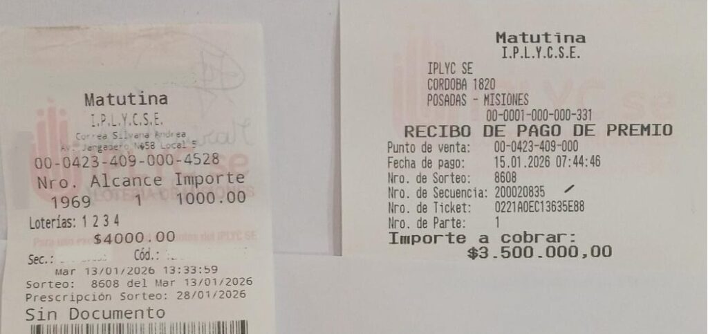 La Agencia 423, de Silvana Andrea Correa, de Puerto Iguazú, siempre está presente con aciertos de relevancia. En esta ocasión, nos hicieron llegar un ticket que se hizo acreedor a 3.500.000,00 pesos, por confiar en “Los vicios”.