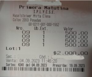 El lunes 4 de septiembre, la Agencia 211, de Mirta Haselsteimer, abonó cupones premiados con “El arroyo”, que apareció a la cabeza de la Quiniela La Primera Matutina Misionera, por un total de 700.000,00 pesos.