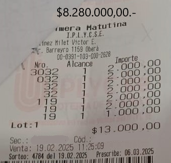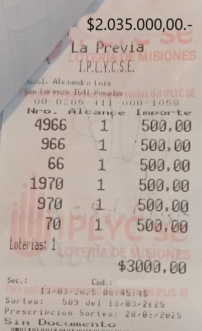 Hace unos días, el vendedor 411 de la Agencia 205 confeccionó una jugada que contenía al 4966, 966 y 66 a la cabeza, para la Quiniela La Previa Misionera. Esto ocurrió en el sorteo 509 del día 13 de marzo pasado y el ticket tuvo un premio de 2.035.000,00 pesos.