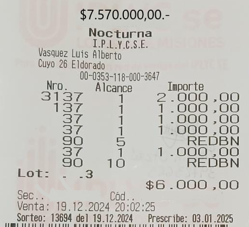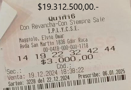 En el Sorteo de Navidad del Quini 6, realizado el domingo 22 de diciembre, la Agencia 418, de Elvio Omar Maggiolo, vendió un ticket que fue favorecido en la modalidad Siempre Sale. El afortunado apostador consiguió acertar cinco números y cobró un dividendo de 19.312.500,00 pesos.