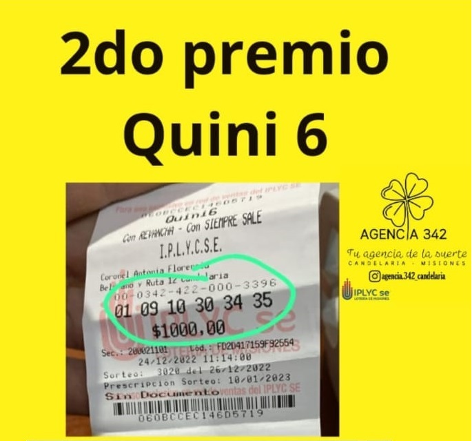 Hoy nos toca comentar un acierto con cinco impactos en el Quini 6, en su Modalidad Siempre Sale. La boleta fue confeccionada en la Agencia 297 (vendedor 001), de Judith Irene Bárbaro y el ganador se quedó con una porción del pozo que se repartió entre 21 ganadores. El dividendo fue de 865.215,81 pesos.