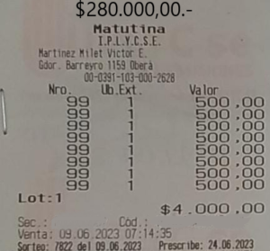 Una boleta ganadora jugada en la Agencia 391, de Víctor Martínez Milet, de la ciudad de Oberá, vino de perillas para un afortunado apostador que se prendió al acierto con el 99 (Los hermanos). El impacto se dio mediante una jugada repartida en ocho renglones, por la suma de 4.000,00 pesos. La recompensa, por seguir a nuestras Cifras Demoradas a los Premios -que en esta ocasión aparecieron a la cabeza-, fue de 280.000,00 pesos.