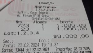 La Agencia 433, de César Eduardo Maffini, de la localidad de Oberá, tiene un atractivo especial para los aciertos. Esta semana, un cliente de la agencia se metió en la “cabeza” que el 723 (El cocinero) era la posta y no se equivocó. Se jugó por entero el miércoles 21 de febrero, en los cuatro sorteos matutinos y el jueves 22, en los cuatro sorteos nocturnos. El apostador recibió 1.340.000,00 pesos, al acertar las tres y dos cifras en la Matutina de Santa Fe y en la  Nocturna de la Provincia.