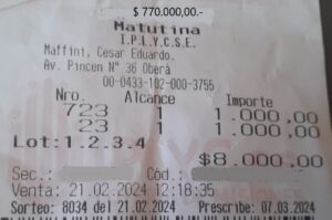 La Agencia 433, de César Eduardo Maffini, de la localidad de Oberá, tiene un atractivo especial para los aciertos. Esta semana, un cliente de la agencia se metió en la “cabeza” que el 723 (El cocinero) era la posta y no se equivocó. Se jugó por entero el miércoles 21 de febrero, en los cuatro sorteos matutinos y el jueves 22, en los cuatro sorteos nocturnos. El apostador recibió 1.340.000,00 pesos, al acertar las tres y dos cifras en la Matutina de Santa Fe y en la  Nocturna de la Provincia.
