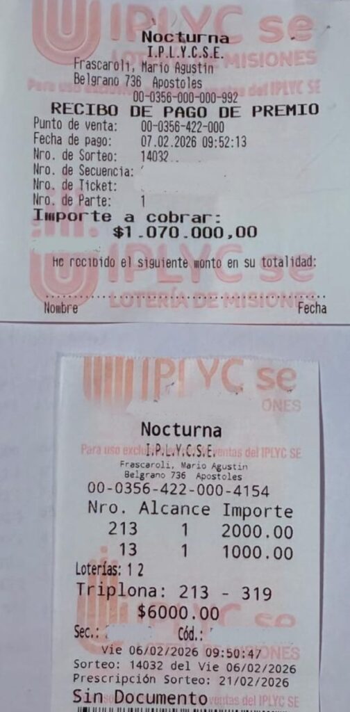 El apostador tenía fe, confió en su corazonada y apostó al 213 (El fraile), el viernes 6 de febrero. Las tres cifras aparecieron como para el festejo en la Quiniela Nocturna Misionera. No le fue nada mal, acertó a la cabeza apostando 3.000,00 pesos y se llevó 1.070.000,00 pesos. Recordemos que la apuesta se jugó en la Agencia 356, de Mario Agustín Frascaroli.