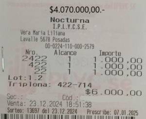 Nuevamente la Agencia 224, de la ciudad de Posadas, se despachó con un premio valioso. Esta vez fue para un apostador que jugó al 2422 en el sorteo de la Quiniela Nocturna Plus del día 23 de diciembre pasado. Vale reecordar que el 22 (El loco) estaba indicado como Favorito de Enredo Numérico y fue fuente de inspiración al afortunado aficionado, que en definitiva se quedó con un premio de 4.070.000,00 pesos.
