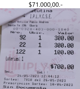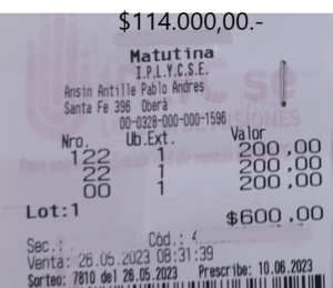 En la Agencia 387, de Esteban Ortiz, de la localidad de Garupá, también se engancharon con nuestro informe y hubo una premiación de 77.500,00 pesos con el 6122 (El loco) al bocho, a las tres y dos cifras.