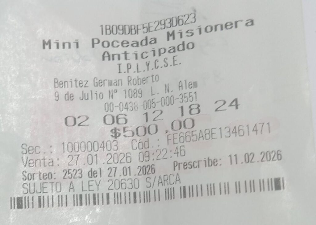 Un trabajador de la ciudad de Leandro N. Alem se ganó el primer premio de la Quiniela Mini Poceada este 27 de enero y se llevó 3.246.928 pesos. Como es costumbre, el hombre hizo su apuesta para el Sorteo N° 2523 en la Agencia 438, de la Capital de la Alegría y se llevó esta grata sorpresa. Al regresar de su trabajo, se puso cómodo, revisó el ticket confeccionado y se enteró de este golpe de suerte. “Siempre juego a los mismos números, también en la Poceada. Vamos a utilizar el dinero para disfrutar. Vamos a ir de vacaciones en familia, aprovechando que todavía no había programado las mías”, dijo el afortunado.