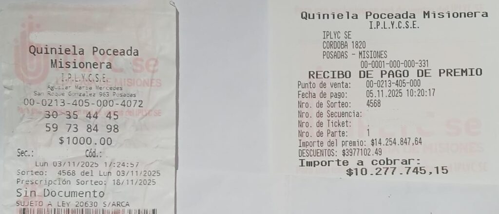 Los seguidores y apostadores de la Agencia 213, de María Mercedes Aguilar, de parabienes. Desde Villa Sarita recibimos un cupón ganador con 7 aciertos. La suma ganada en el sorteo 4568 fue de 10.277.745,15 pesos.
