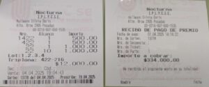 Además, hubo un buen acierto con el 195 (Los anteojos) a la cabeza, por 640.000,00 pesos. Luego, con el 422 (El loco) a las tres y dos cifras a la cabeza y a los diez, por 334.000,00 pesos; con el 3215 (La niña bonita), a las cuatro, tres y dos cifras a la cabeza, por un importe de 1.164.000,00 pesos y con el 15 (La niña bonita) a la cabeza y el ambo en una redoblona con el 51 (El serrucho), a los diez y a los viente, por 443.947,37 pesos.