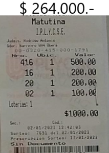 Apenas iniciado el año, recibimos un ticket de la Quiniela Matutina que fue jugado con el vendedor 415, la misma corresponde al sorteo 7691 del 02 de enero. El acierto conseguido mediante el 416 (El anillo) a las tres y dos cifras a la cabeza, le reportó 264.000 pesos al feliz ganador.