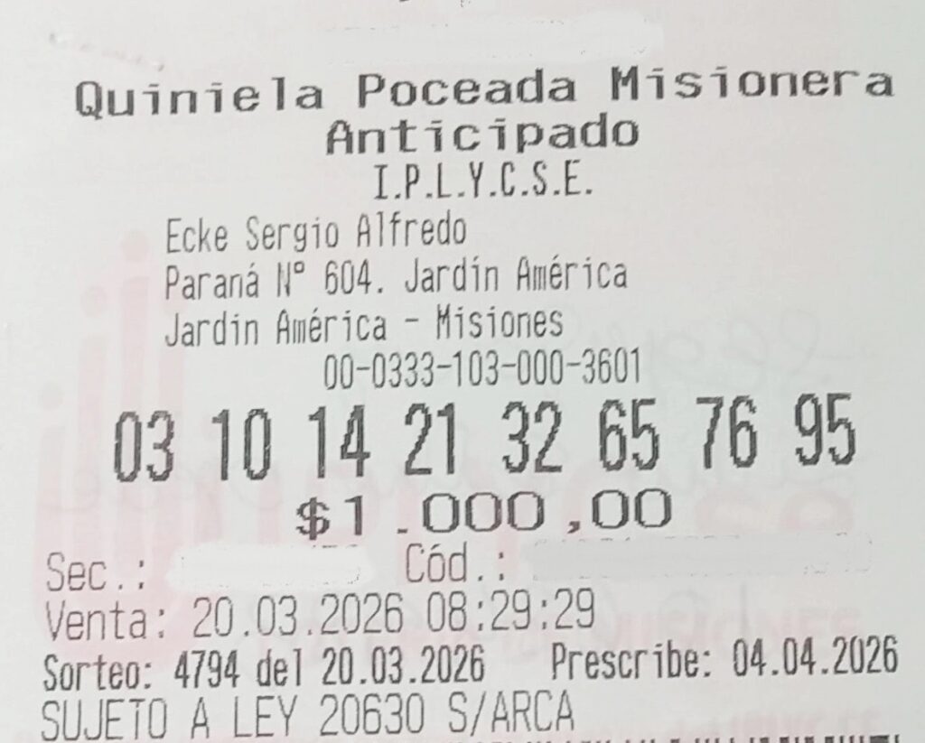 Una jubilada de Jardín América se llevó 32.300.243 pesos con el primer premio de la Poceada Misionera. Fue en el Sorteo Número 4794 del 20 de marzo, tras realizar una jugada en la Agencia 333, de esta localidad.