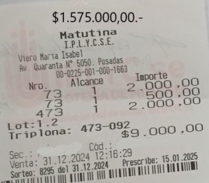 El sábado 31 de diciembre de 2024 hubo otro cupón ganador en esta agencia. Ese día, un inspirado aficionado se alzó con buena cantidad de dinero, algo así como 1.575.000,00 pesos, con una apuesta a la cabeza con el 473 (El hospital), a las tres y dos cifras, en la Quiniela Matutina Misionera.