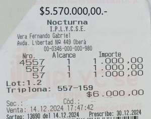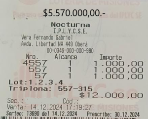 Dos boletas ganadoras jugadas en la Agencia 346, de la ciudad de Oberá, llenaron de alegría a un apostador, que acertó a las cuatro, tres y dos cifras del sorteo de la Nocturna Misionera del día 14 de diciembre, oportunidad en que en el primer lugar se ubicó el 4557 (El jorobado). La recompensa para el aficionado fue de 11.140.000,00 pesos.