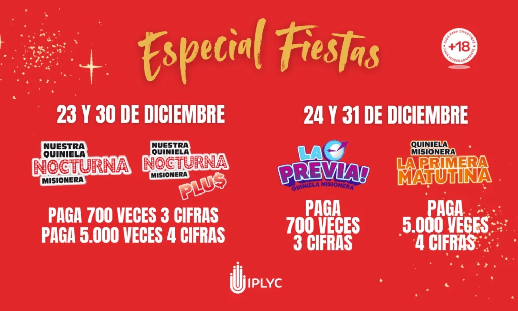 En el IPLyC, la Navidad y el Fin de Año vienen con premios extra. Para que los apostadores se preparen para cerrar el año con la mejor suerte, el IPLYC trae el «Especial Fiestas» de la Quiniela Misionera, que tendrá sorteos imperdibles en diciembre.