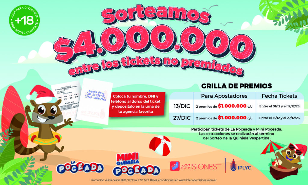 El próximo sorteo se realizará el 27 de diciembre, donde se conocerá a otros dos ganadores, con el mismo monto. Para participar del sorteo, los jugadores deberán depositar en las urnas habilitadas en las Agencias Oficiales de toda la provincia, tickets no ganadores de la Poceada Misionera y Mini Proceda. En la parte posterior del ticket, el participante deberá detallar nombre, apellido, DNI y número de teléfono celular. Para participar de los sorteos semanales, serán válidos aquellos tickets que estén encuadrados en las fechas programadas. En el segundo sorteo, que se hará el 27 de diciembre, con cupones que irán desde el 13 al 26 de diciembre, inclusive, también habrá dos extracciones de un millón de pesos cada una.