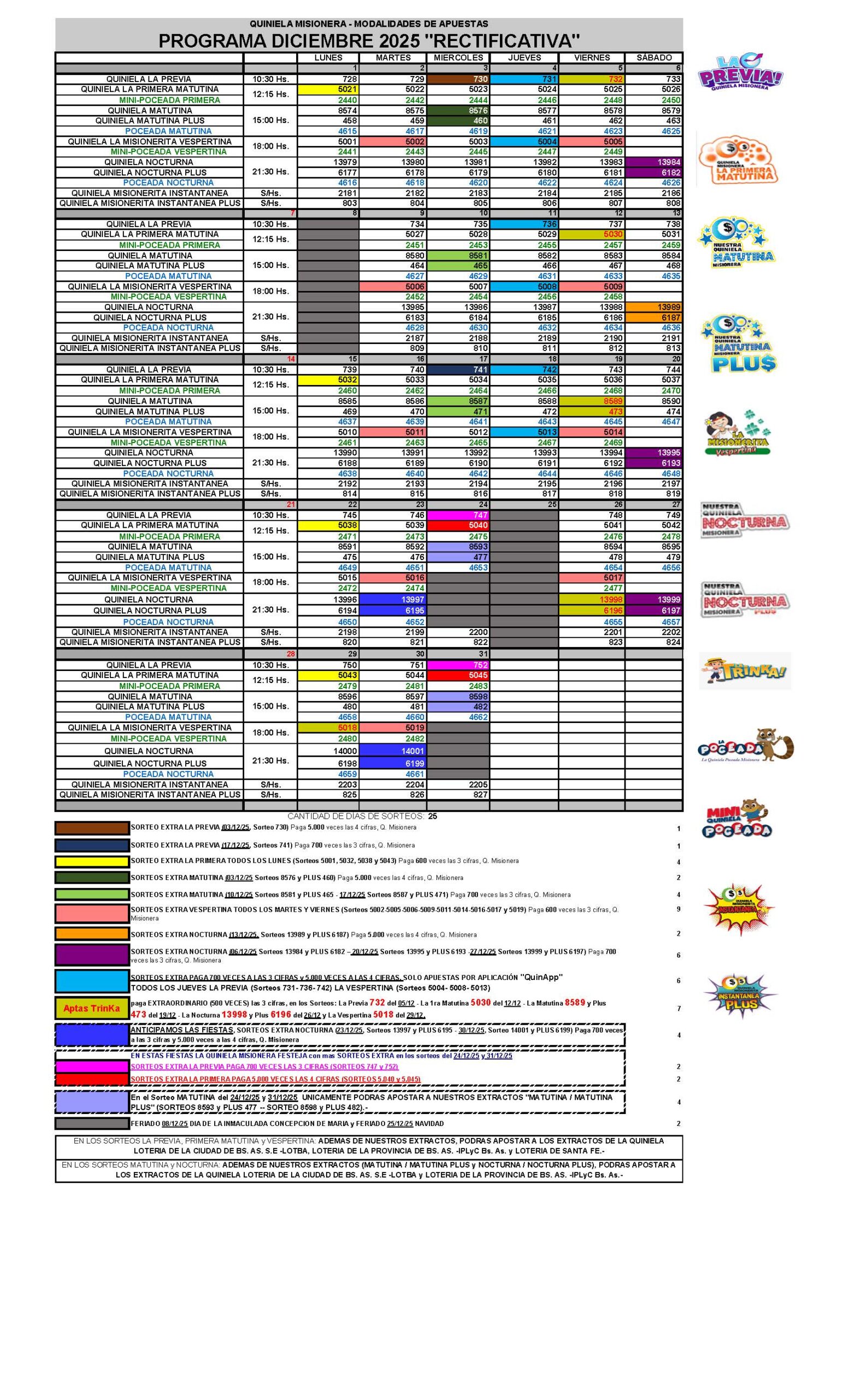 Programa mensual de Quiniela y sus modalidades del mes de diciembre/2025