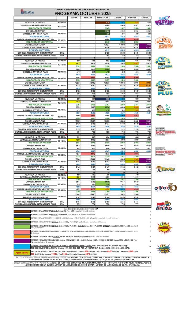 Programa mensual de Quiniela y sus modalidades del mes de octubre/2025