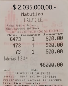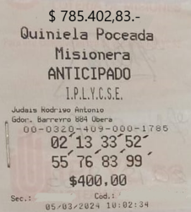 Una semana realmente espectacuar en materia de aciertos tuvo la tradicional Agencia 320, de Rodrigo Antonio Judais, de la localidad de Oberá. Hoy nos toca referirnos a dos aciertos a las cuatro, tres y dos cifras por vía del 6473 (El rengo), con una recompensa final de 6.105.000,00 pesos. Esto sucedió en el sorteo de la Quiniela Matutina del lunes 4 de marzo.