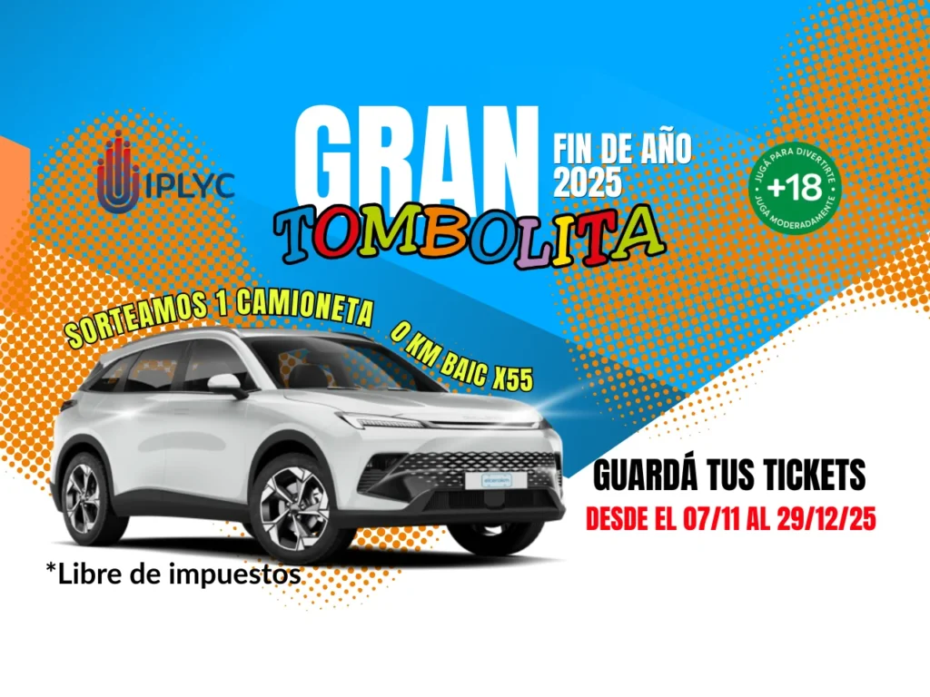 Con el último ticket confeccionado para el sorteo Nocturno del 29 de diciembre, se cerrará la posibilidad de participar del sorteo de la última Tombolita del año, que premiará a sus seguidores con un automóvil 0 kilómetro. El sorteo especial tendrá lugar el martes 30 de diciembre, a las 11, y premiará al afortunado con una camioneta 0KM BAIC X55 II motor 1.5 T 185 HP, trasmisión DCT */ma., 8 airbags, pantalla multimedia,10,1”, cámara panorámica 360° y llantas 19” que puede ser observada durante las recorridas promocionales que se realizan por las calles de la capital provincial.