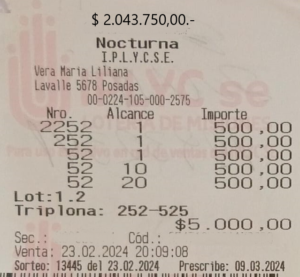 Una boleta ganadora jugada en la Agencia 224, de María Liliana Vera, salvó para los gastos mediante el 2252 (Madre e hija), cifras que aparecieron en la Quiniela Nocturna Tradicional del día 23 de febrero pasado. El 252 estaba indicado en nuestra Breva al Caer de esa semana. El acierto fue más que productivo, en el que el apostador acertó a las cuatro, tres y dos cifras, para llevarse 2.043.750,00 pesos.