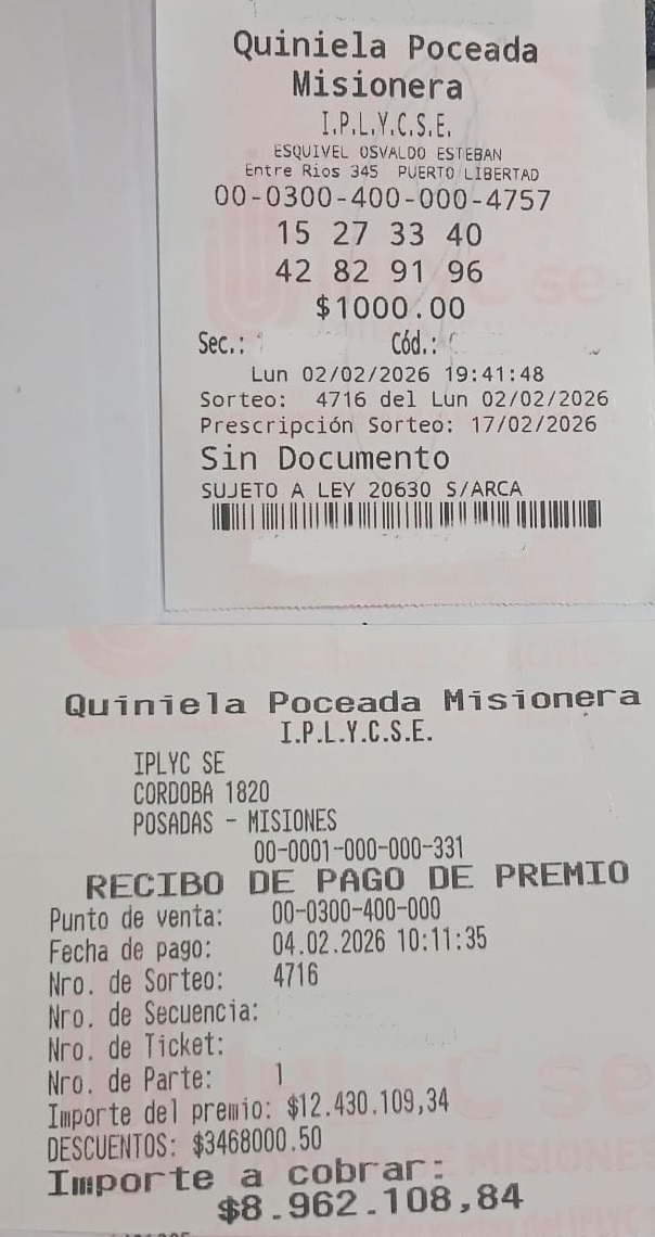 La Agencia 224, de María Liliana Vera, de la ciudad de Posadas, nuevamente se asoció con el éxito. Esta vez, hubo un cliente que acertó a las cuatro, tres y dos cifras a la cabeza, por vía del 8524 (El caballo), en la Quiniela La Primera Matutina Misionera del 11 de febrero pasado. El afortunado se ganó 8.140.000,00 pesos. Nos alegramos por la sintonía y buenas ondas de la Agencia 224 y porque haya sido sintonizada por el cliente, lo que le permitió llevarse una buena suma de dinero.