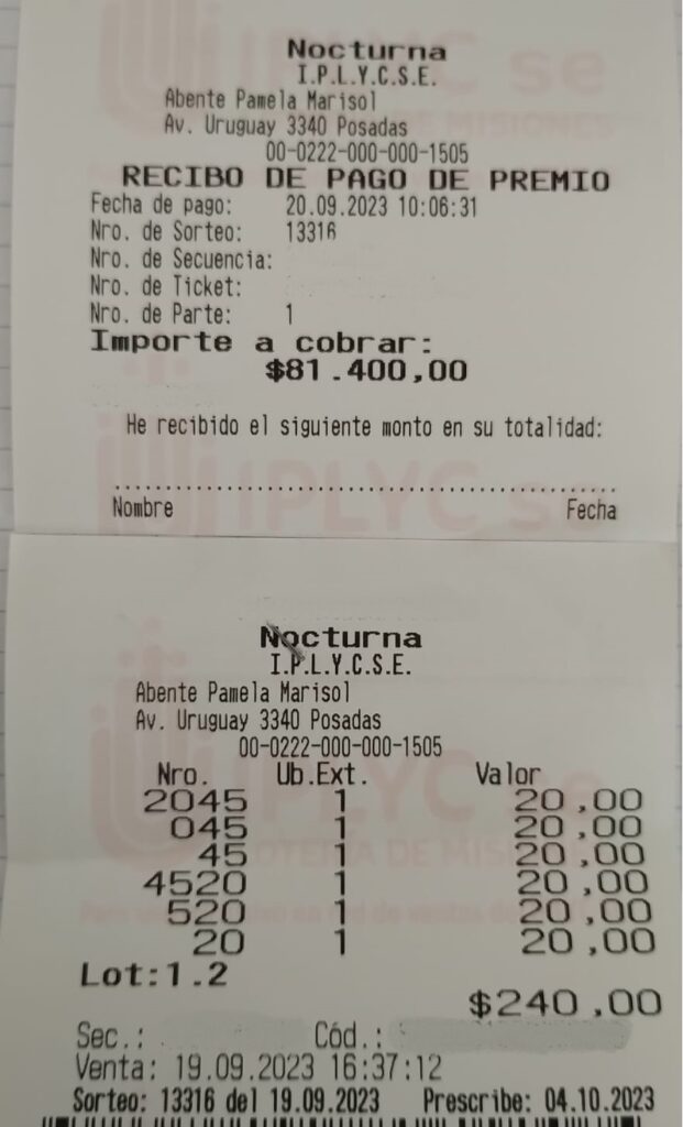 Desde la Agencia 222, de la ciudad de Posadas, nos acercaron la copia de un cupón que no tiene desperdicio. El feliz apostador la hizo completita, a las cuatro, tres y dos cifras mediante el 2045, que salió a la cabeza en el sorteo de la Quiniela Nocturna Plus del martes 19 de septiembre y se ganó 81.400,00 pesos.