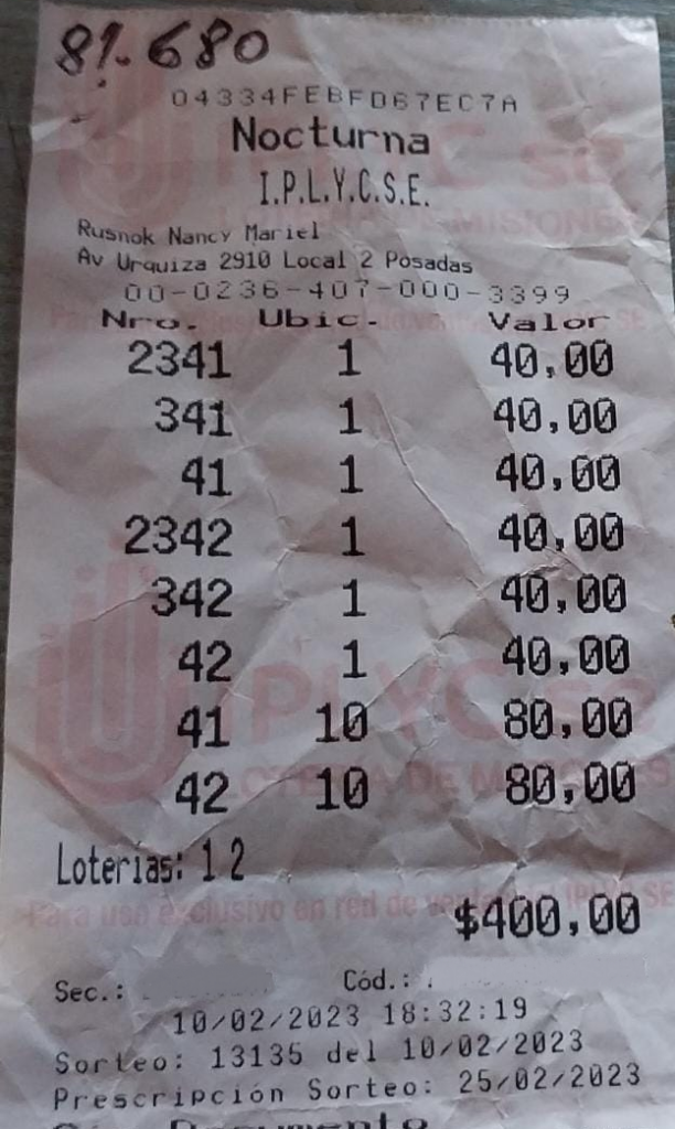 Desde la Sub Agencia 407 de la Agencia 236, de Posadas, recibimos un ticket ganador que tiene una anécdota para comentar. El cliente jugó y acumuló muchas boletas, decidió tirarlas al cesto de basura, pensando que no había acertado, incluyendo a ésta que tenía premio. Después de varias corridas y de la insistencia de su quinielera, la recuperó y pudo cobrar su premio de 81.680 pesos. El acierto se dio con el 2342 a las cuatro, tres y dos cifras a la cabeza y a los diez. El número fue cantado en la Quiniela Nocturna del viernes 10 de febrero. Bueno es señalar, que el ambo era uno de nuestros recomendados en el ¡Numerazo! de la semana pasada.